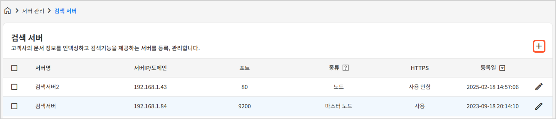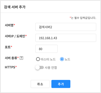 시스템 관리자는 관리자 웹페이지에서 검색 서버를 등록하고 수정, 삭제할 수 있습니다.