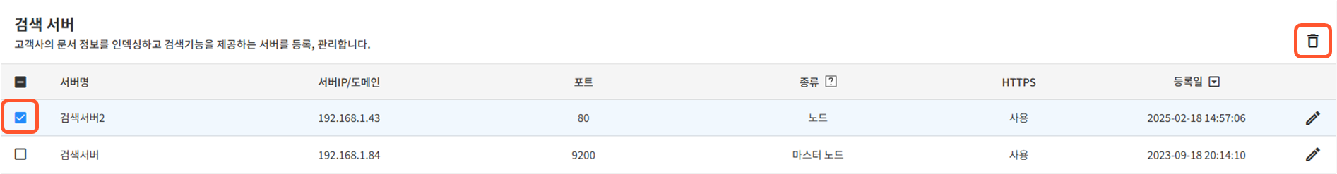 1. 검색 서버 목록에서 삭제하려는 서버를 하나 이상 선택하면 우측 상단의