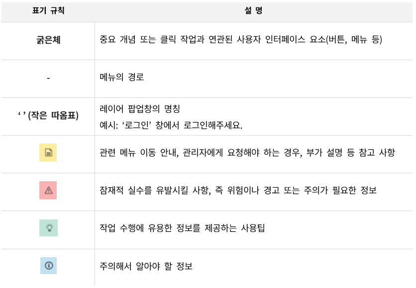 매뉴얼 표기 규칙 관리자의 종류 표시 aidoc이 멀티도메인으로 구축된 경우에는 서비스 관리자와 시스템 관리자가 사용할 수 있는 기능과 웹페이지 메뉴 구성이 달라집니다. 반면, 싱글도메인의 경우에는 관리자의 구분 없이 시스템 관리자가 서비스 관리자 기능까지 모두 담당하며, 웹페이지 메뉴도 통합되어 있습니다. 본 매뉴얼에서는 편의상 멀티도메인 환경을 기준으로 서비스 관리자, 시스템 관리자가 담당하는 기능을 구분하여 표시합니다. 따라서 싱글도메인의 ...