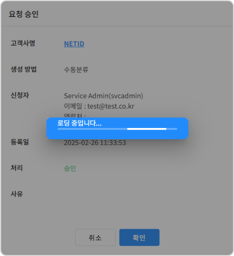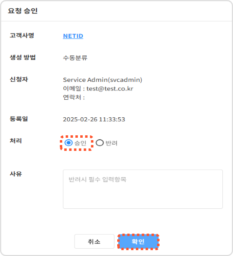 4. 다음과 같은 ‘요청 승인’ 창이 팝업되면, 처리 항목을 ‘승인’ 혹은 ‘반려’로 선택하고 확인을 클릭합니다. ‘반려’를 선택한 경우에는 사유란에 서비스 관리자가 참고할 반려 이유를 반드시 입력합니다.
