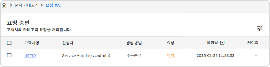 2. 서브 도메인으로부터 수신된 카테고리 생성 요청 목록을 보여주는 ‘요청 승인’ 화면이 나타납니다.