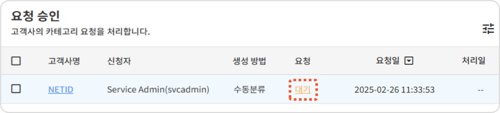 3. 승인되지 않은 카테고리 생성 요청은 요청 항목이 ‘대기’로 표시됩니다. 승인할