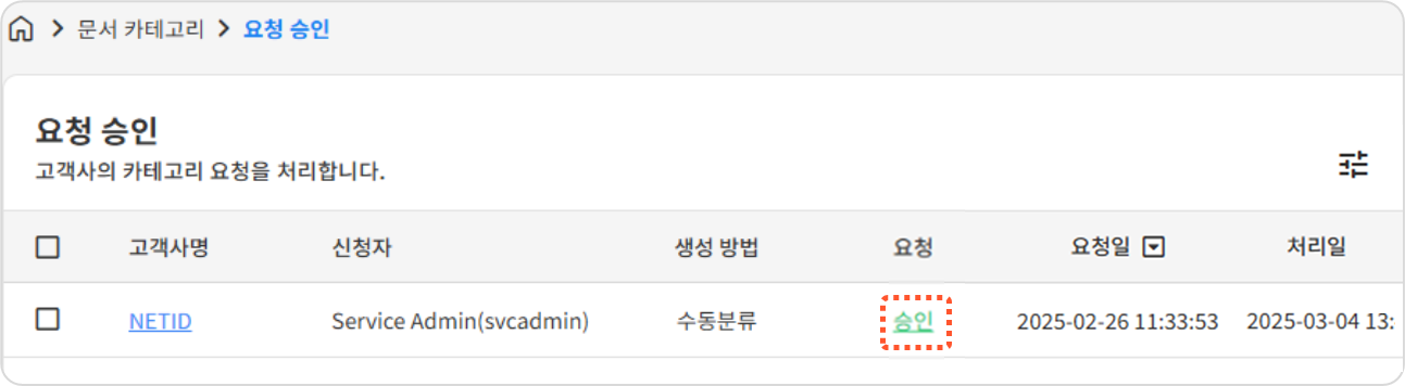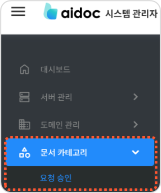 웹페이지의 좌측 메뉴에서 문서 카테고리 – 요청 승인을 클릭합니다.