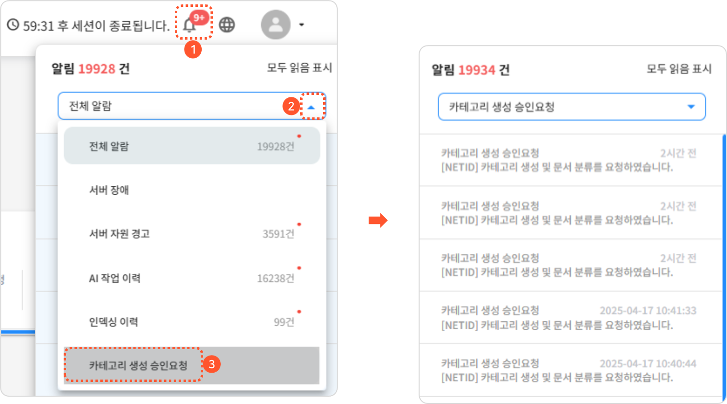 수신된 알림 목록을 보여주는 ‘알림’ 창이 나타납니다. 이 창의 드롭다운 목록에서 ‘카테고리 생성 승인요청’을 선택하면, 수신된 모든 카테고리 생성 요청을 확인할 수 있습니다.