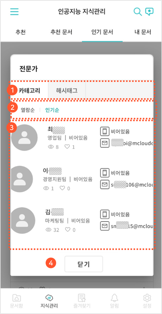 문서 또는 전문가 추천 목록에서 작성자 또는 전문가 이름을 터치하면, 다음과 같이 작성자/전문가의 상세 정보와 작성한 문서를 확인할 수 있습니다. 문서의 작성자 또는 전문가에 대해 다음의 정보를 제공합니다. 기본 정보: 이름, 부서 및 직급 연락처: 전화 번호, 이메일 주소 문서 열람 정보: 작성한 전체 문서의 조회 수 합계 및 좋아요 수 합계 문서 정렬: 작성한 문서를 열람순, 인기순, 최신순으로 정렬할 수 있습니다. 작성한 문서 목록이 ...