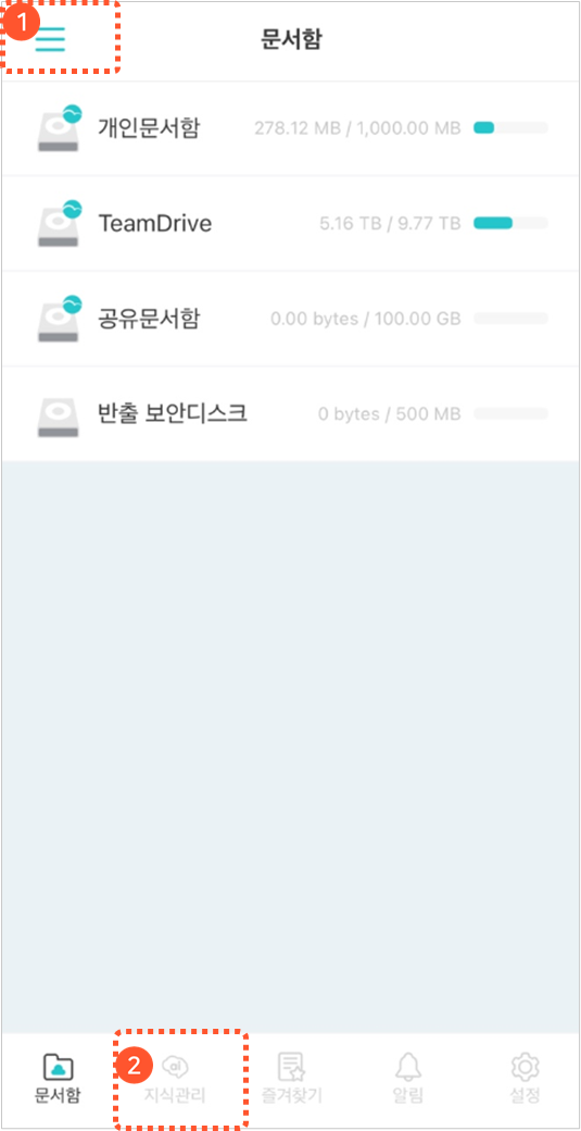 하단 메뉴: 문서함, 지식관리, 즐겨찾기, 알림, 설정