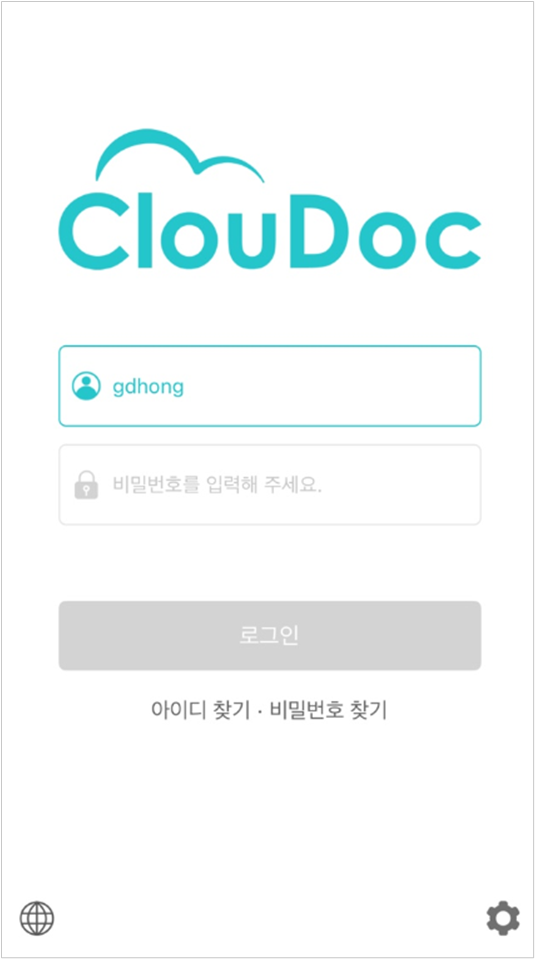 1. 클라우독 모바일 앱을 실행하고 문서중앙화 계정으로 로그인합니다. 로그인하는 자세한 방법은 클라우독 매뉴얼 - 모바일 앱에서 로그인/로그아웃하기를 참고합니다.