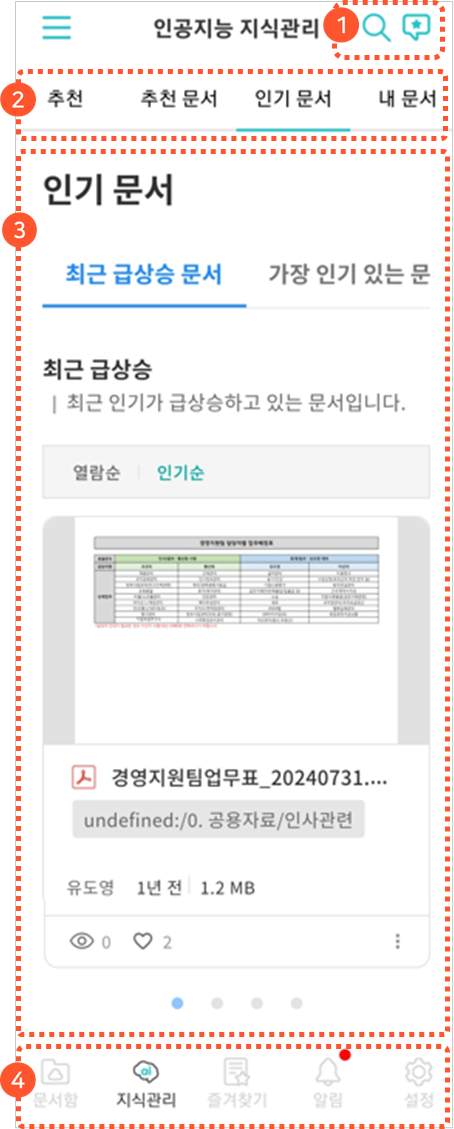 추천 문서, 인기 문서, 내 문서 목록이 포함되는 경우 표시되는