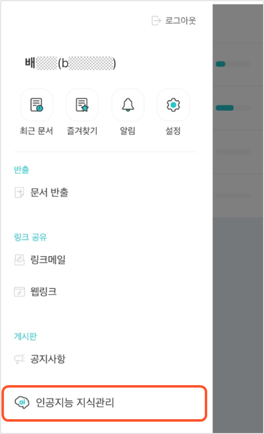 좌측 상단의 메뉴 아이콘 터치한 후 표시되는 사이드 메뉴 창에서 인공지능 지식관리를 선택하여 인공지능 지식관리 페이지로 이동할 수 있습니다.