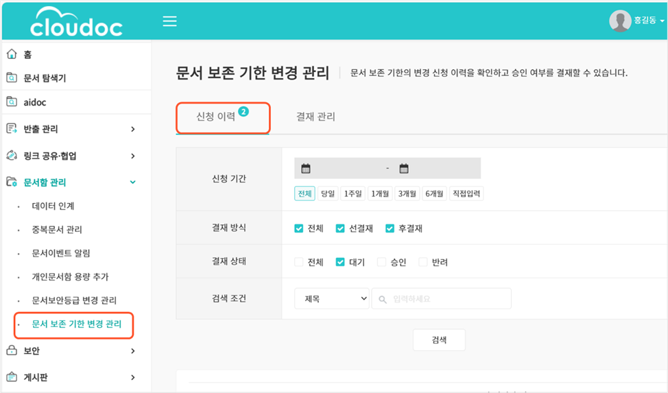 사용자는 웹페이지에서 본인이 신청한 문서 보존 기한 변경 신청 이력과 결재 상태를 확인할 수 있습니다.