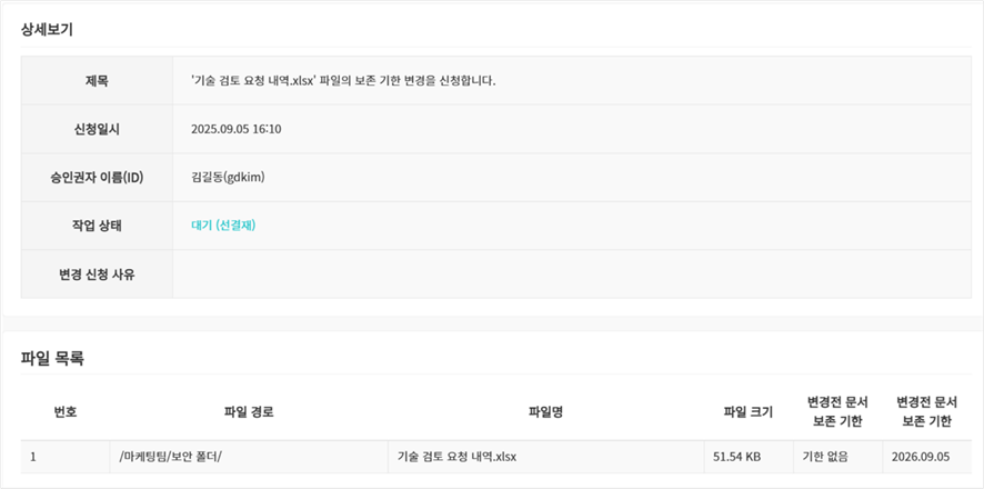 - 대기: 문서 보존 기한 변경 신청 후 승인권자의 승인을 기다리는 상태입니다.