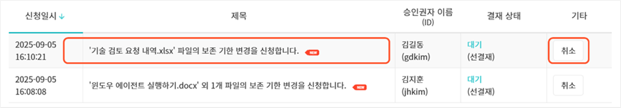 - 승인: 문서 보존 기한 변경 신청을 승인권자가 승인을 완료한 상태입니다.