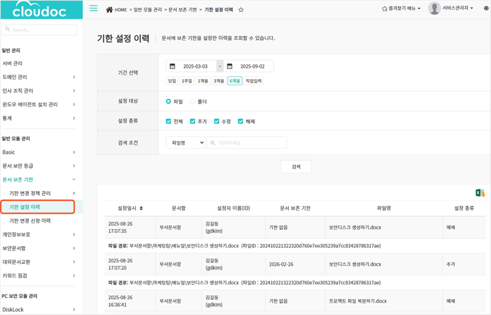 - 설정일시: 문서 보존 기한이 설정된 일시