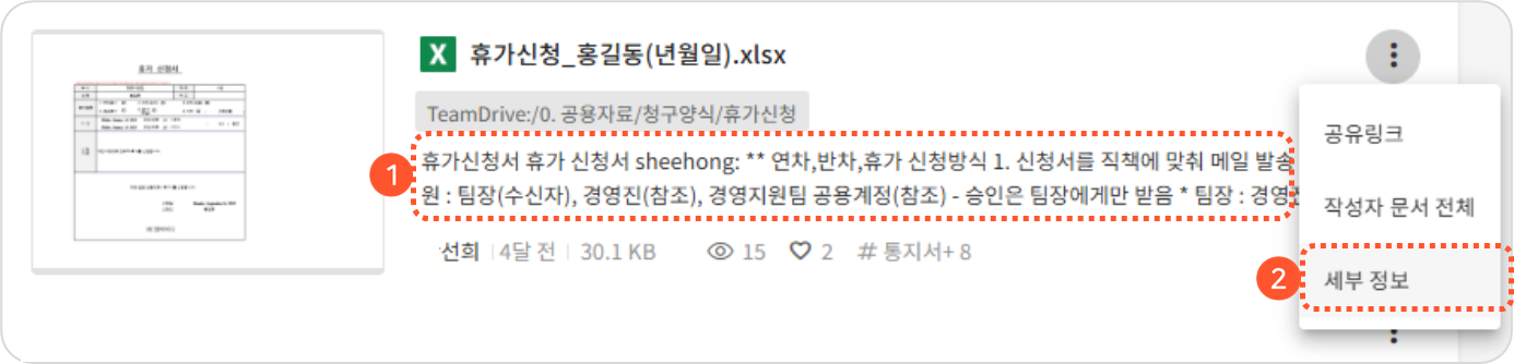 aidoc 웹 서비스 화면의 문서 목록에서 ❶ 문서 내용을 클릭하거나 각 문서의 추가 메뉴에서 ❷ 세부 정보