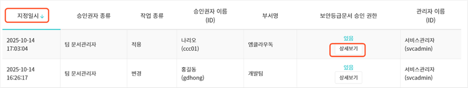 문서함/폴더에서 보안등급문서 승인권자를 지정하고, 보안등급별 승인 권한을 설정한 이력을 확인할 수 있습니다.