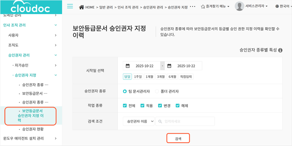 2. 보안등급문서 승인권자 지정 이력 페이지에서 조회를 위한 조건을 선택합니다.