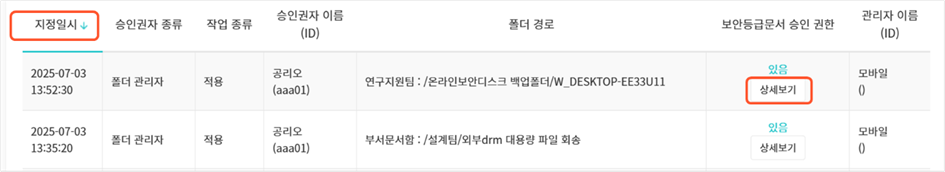 - 작업일시, 승인권자 종류, 작업 종류, 승인권자 이름(ID), 폴더 경로, 보안등급문서 승인 권한, 관리자 이름(ID)가 표시됩니다.