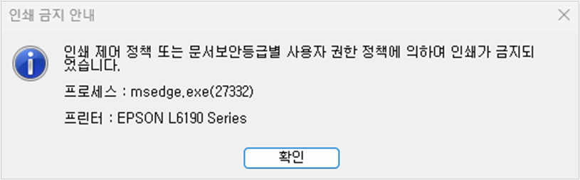 PC 보안 정책이 적용되면, 업무용 애플리케이션 사용 시에만 관리자가 등록한 프린터에 한해 인쇄가 가능하며, 그 외의 프린터나 애플리케이션 사용 시에는 인쇄가 불가능하게 됩니다.