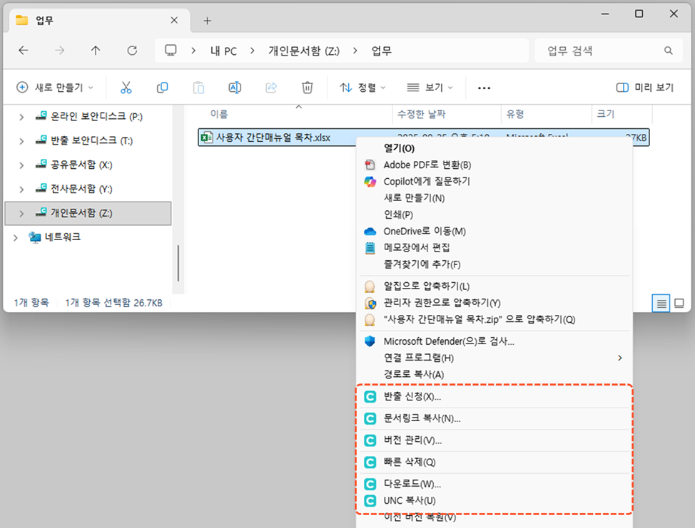 위 그림의 문서중앙화 메뉴는 기본 설정을 따르는 고객사의 사용자가 개인문서함 파일 선택 시 사용 가능한 메뉴이며, 문서중앙화 솔루션에서 제공 가능한 전체 컨텍스트 메뉴는 윈도우 탐색기 컨텍스트 메뉴 소개에서 확인할 수 있습니다.