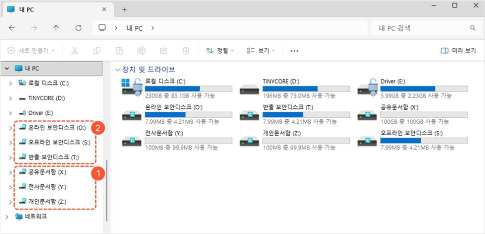 윈도우 에이전트를 실행하면 파일 탐색기에서 다음과 같은 문서중앙화 드라이브를 사용할 수 있게 됩니다.