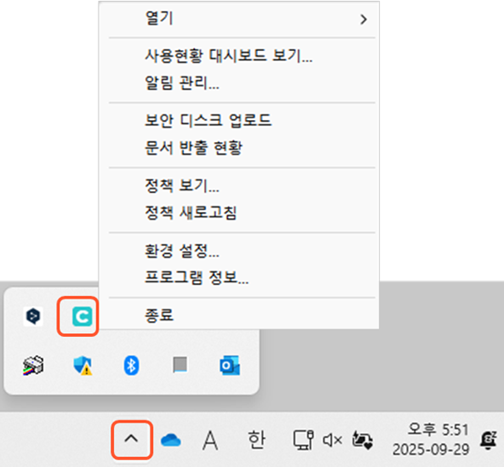 윈도우 작업표시줄에서 ClouDoc 아이콘을 우클릭하면 다음 그림과 같은 트레이 메뉴가 표시됩니다.