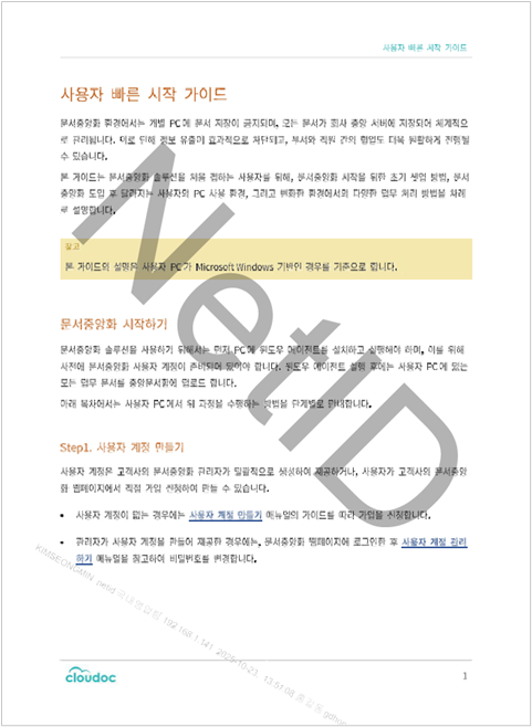 PC 보안 정책이 적용되면, 인쇄되는 모든 출력물에 다음의 예와 같이 관리자가 등록한 워터마크가 함께 인쇄됩니다.