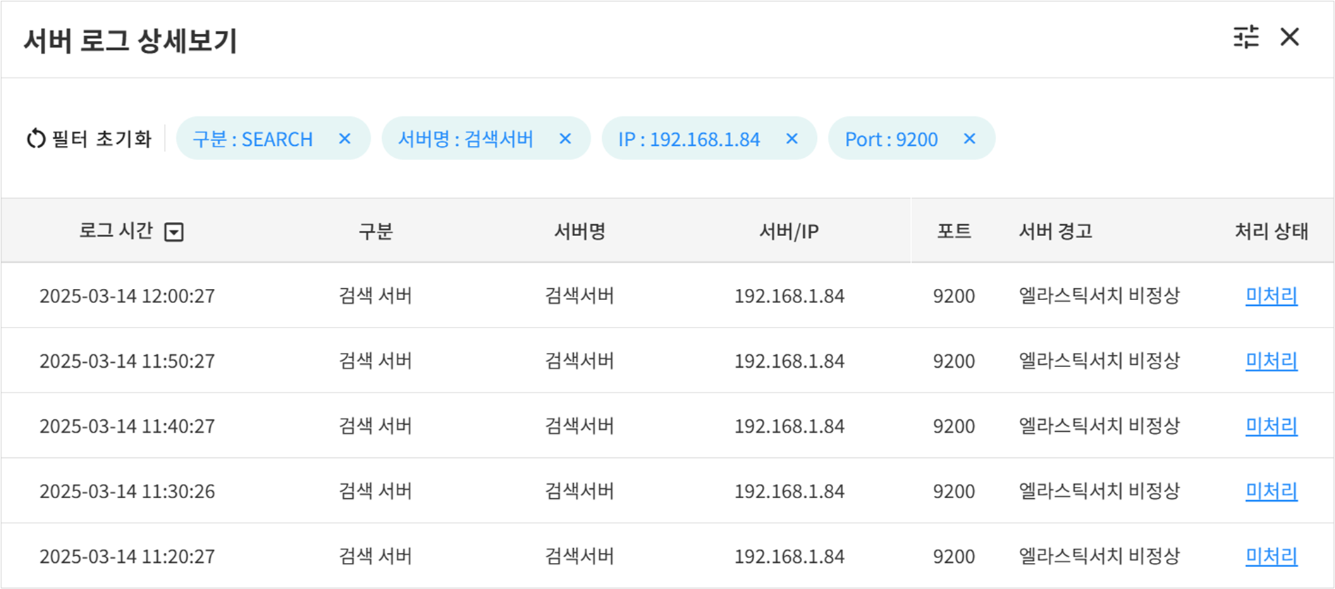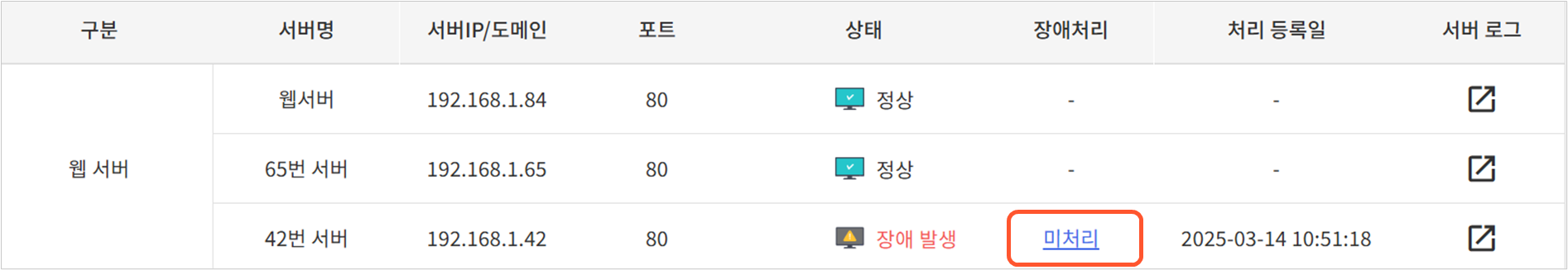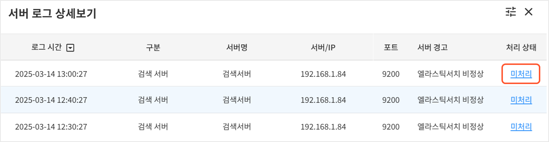 로그 목록 중 가장 최신 로그(목록의 맨 위)의 처리 상태에서 미처리 링크를 클릭하여 장애 처리 상태를 변경합니다.