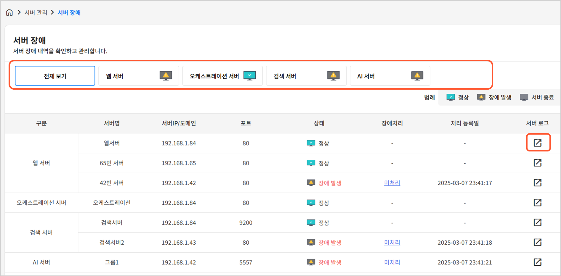 1. 서버 장애 목록에서 장애가 발생한 서버의 서버 로그 아이콘