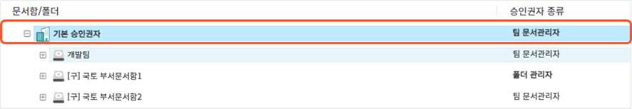 루트 폴더에 위치하는 기본 승인권자는 승인권자를 지정하지 않은 모든 문서함/폴더의 기본 승인권자가 됩니다. 디폴트 값은 팀 문서관리자로 설정됩니다.