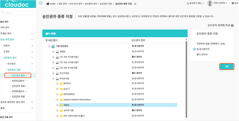 2. 좌측 폴더 목록에서 승인권자를 지정할 문서함/폴더를 선택하고, 우측 승인권자 종류 지정에서 팀 문서관리자와 폴더관리자 중에서 선택합니다.