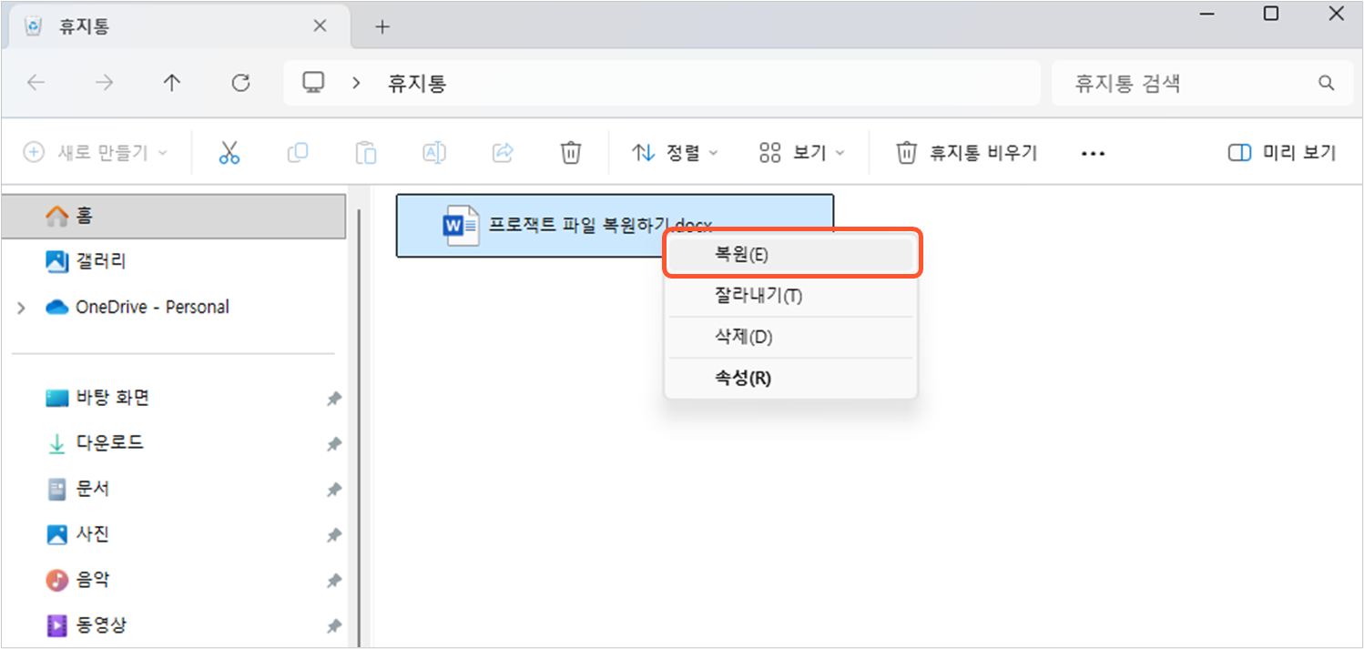 2. 복원할 파일을 마우스 오른쪽 버튼으로 클릭하고 ‘복원’을 선택하면 삭제되었던 파일은 삭제되기 전 위치로 복구됩니다.