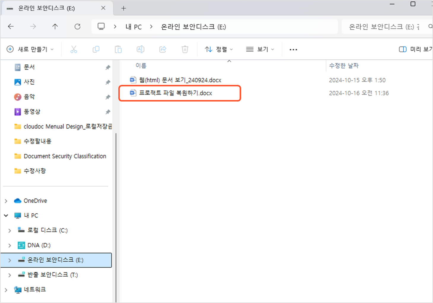 3. 온라인 보안디스크에서 복원된 파일을 확인할 수 있습니다.