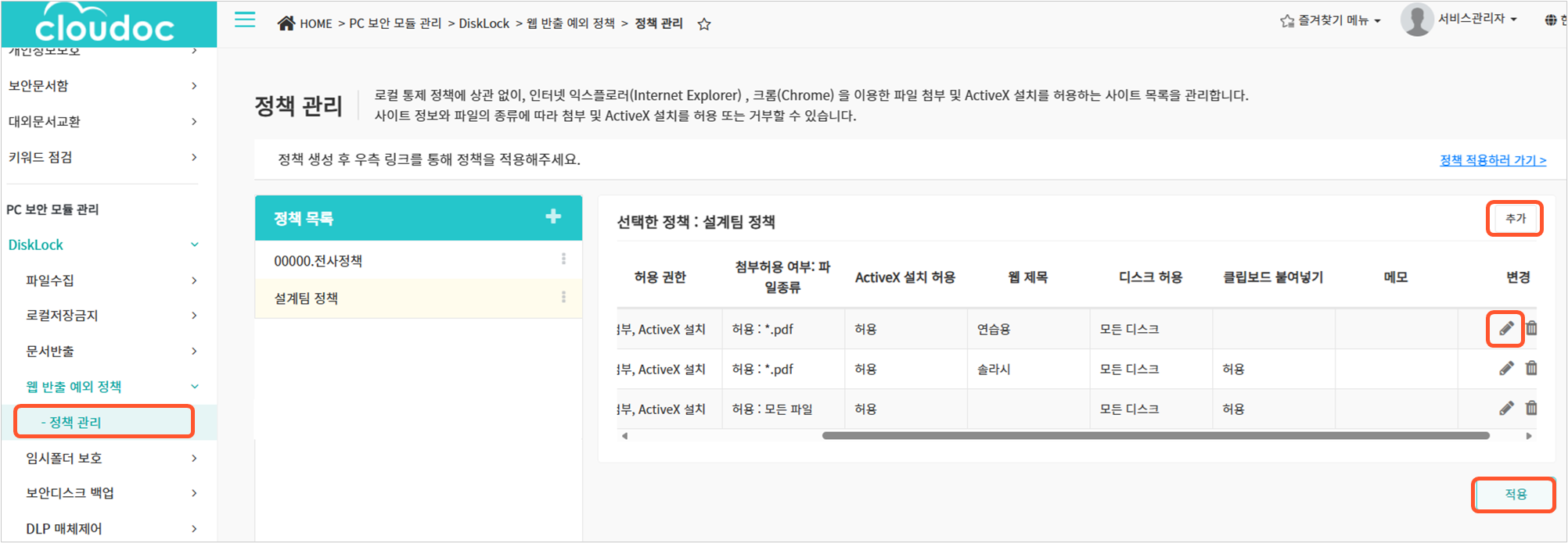7. 정책 아이템 목록 하단의 적용 버튼을 클릭하여 정책 변경 사항을 서버에 적용합니다.