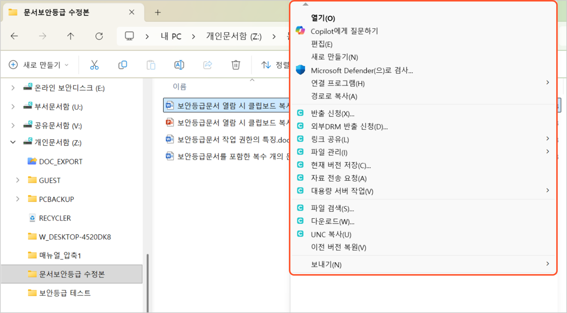 파일에 문서보안등급을 설정할 수 있습니다. 부서문서함에서 해당