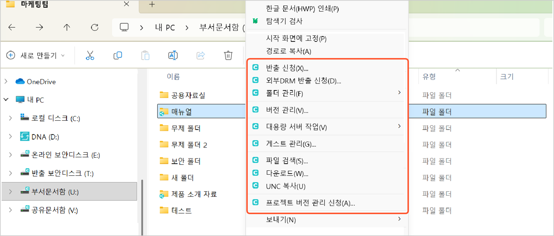 - 선택한 폴더/파일이 위치하는 문서함의 종류(개인문서함, 부서문서함, 공유문서함)에 따라 허용되는 메뉴가 다릅니다.