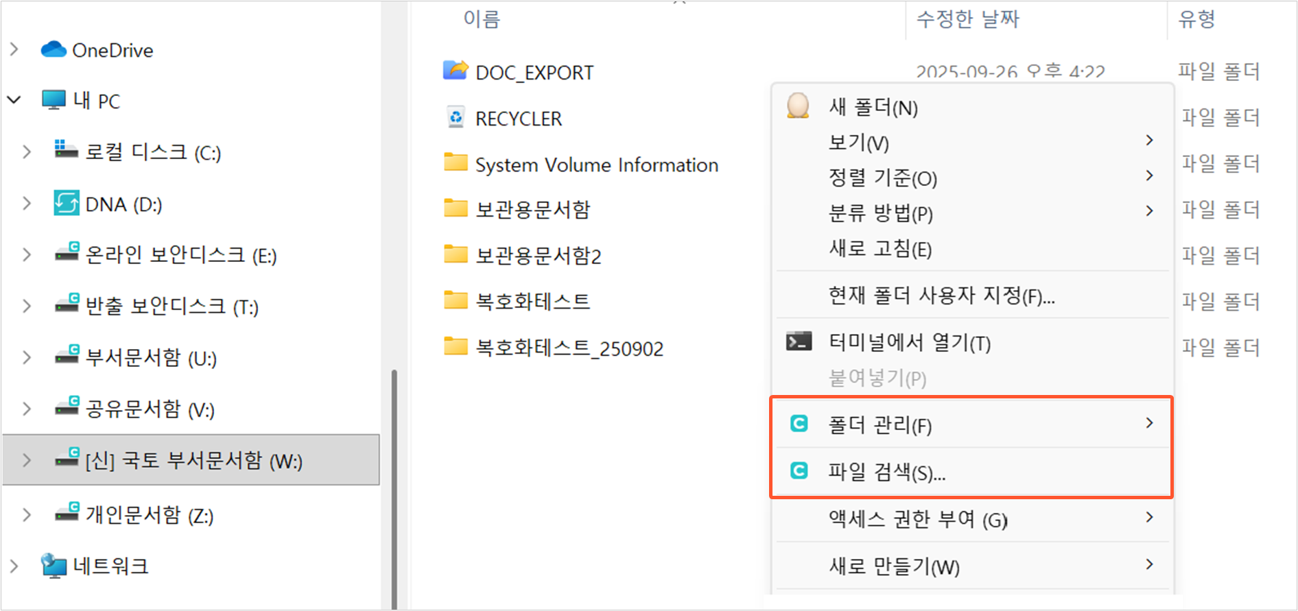 - 특수 폴더(예: DOC_EXPORT, RECYCLER 폴더 등) 내 폴더/파일에 대해서는 해당 폴더에만 적용 가능한 별도의 메뉴가 표시됩니다.