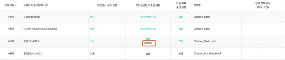 - 있음: 일부 보안등급에 대해 자가승인 권한을 보유한 경우로, 상세보기를 클릭하여 등급별 자가 승인 허용 여부를 확인할 수 있습니다.