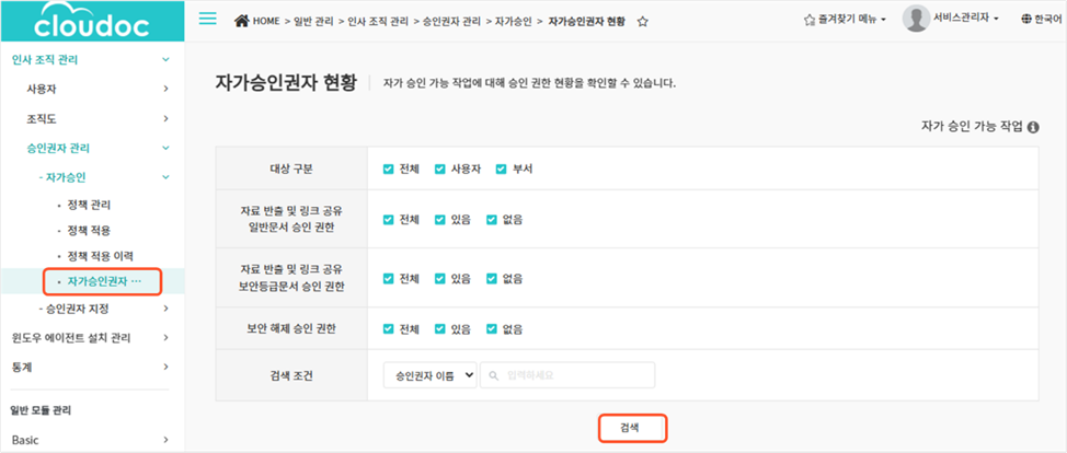 - 사용자 이름(ID)/부서명: 자가승인 권한이 적용된 사용자 이름(ID) 혹은 부서 이름