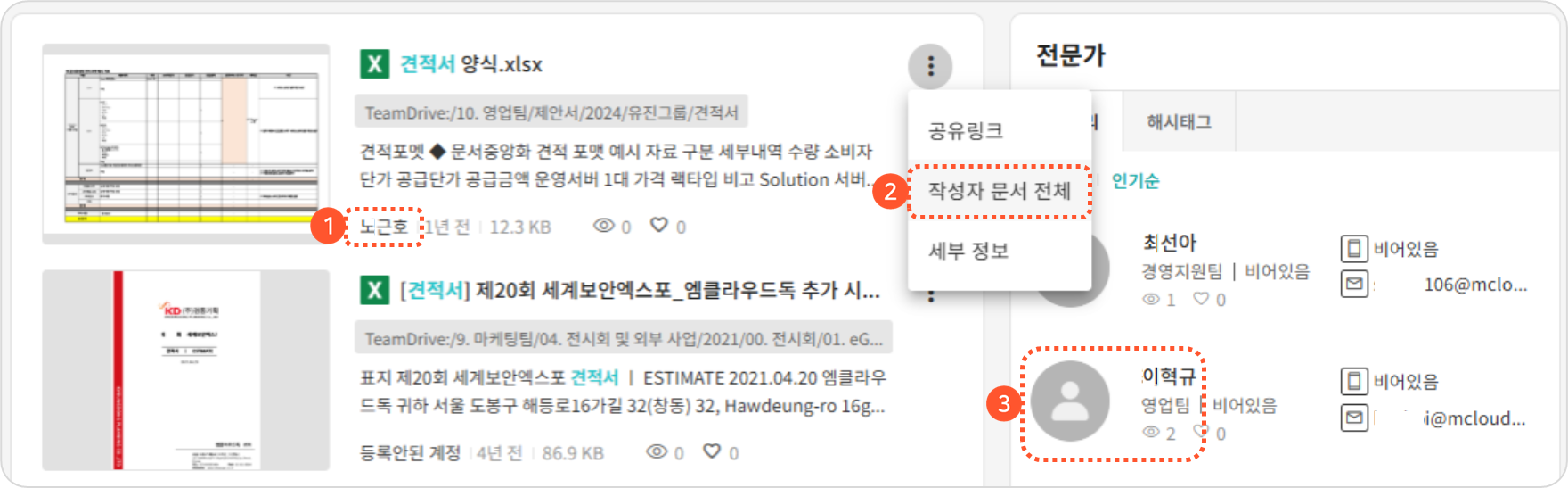 문서 또는 전문가 추천 목록에서 작성자 또는 전문가 이름을 터치하면, 다음과 같이 작성자/전문가의 상세 정보와 작성한 문서를 확인할 수 있습니다. 문서의 작성자 또는 전문가에 대해 다음의 정보를 제공합니다. 기본 정보: 이름, 부서 및 직급 연락처: 전화 번호, 이메일 주소 문서 열람 정보: 작성한 전체 문서의 조회 수 합계 및 좋아요 수 합계 문서 정렬: 작성한 문서를 열람순, 인기순, 최신순으로 정렬할 수 있습니다. 작성한 문서 목록이 ...