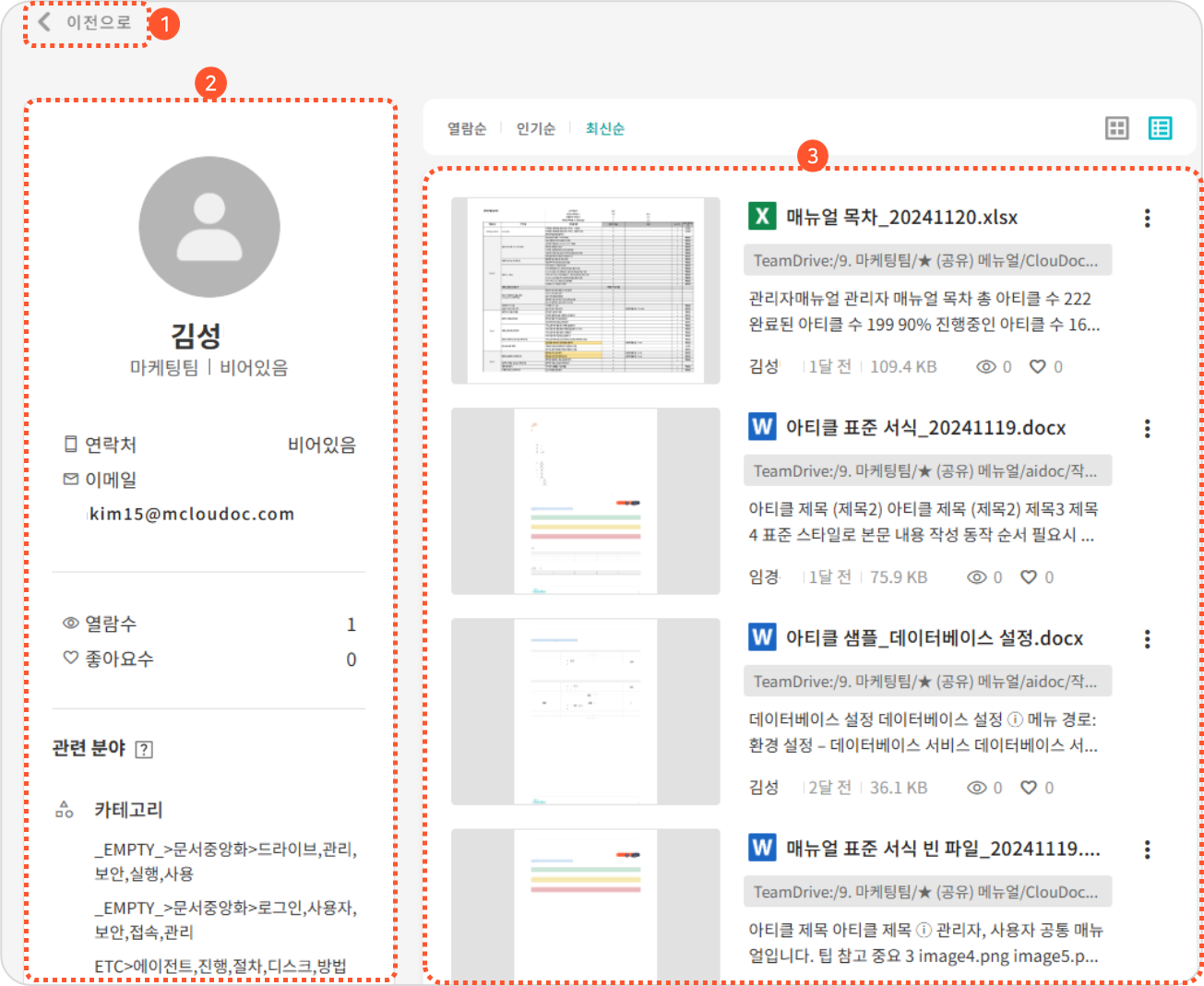 ‘작성자 상세 정보’ 화면은 ❶ 이전 화면 이동 버튼, ❷ 작성자 정보 영역, ❸ 작성자 문서 목록 영역으로 구성되어 있습니다.