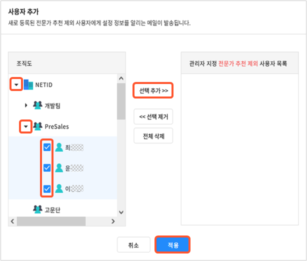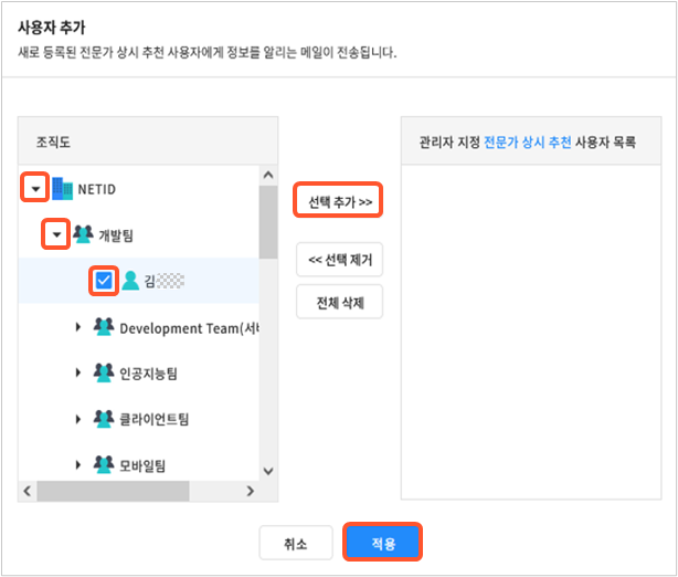 ③ 관리자 지정 상시 추천 사용자 등록: 등록된 사용자는 상시 전문가로 추천됩니다. 상시 추천 사용자로 등록된 사용자는 본인이 전문가 추천 제외를 설정한 경우에도 전문가로 추천됩니다.