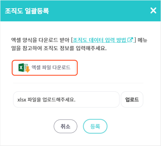 2. ‘조직도 일괄등록’ 창에서 엑셀 파일 다운로드를 클릭하여 엑셀 양식을 다운로드합니다.