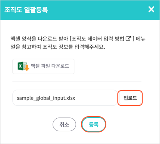 4. ‘조직도 일괄등록’ 창에서 업로드 버튼을 클릭하여 위에서 작성한 파일을 선택한 후, 등록 버튼을 클릭합니다.