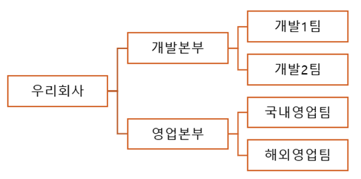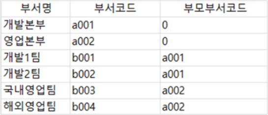 - 부모 부서코드: 부서 트리에서 상위 부서가 존재하는 경우 상위 부서의 부서코드를 입력합니다. 상위 부서가 없는 경우에는 0을 입력합니다. 위의 입력 예시는 아래와 같은 조직도 구성을 반영한 것입니다.