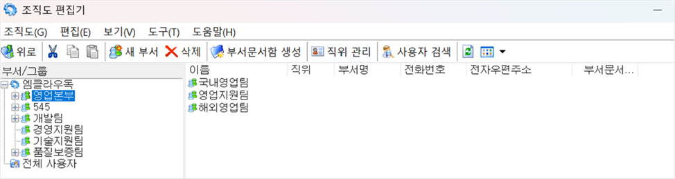 6. 부서 등록 내용은 조직도 편집기를 실행하여 확인할 수 있습니다.