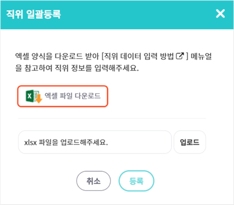 2. ‘직위 일괄등록’ 창에서 엑셀 파일 다운로드를 클릭하여 엑셀 양식을 다운로드합니다.