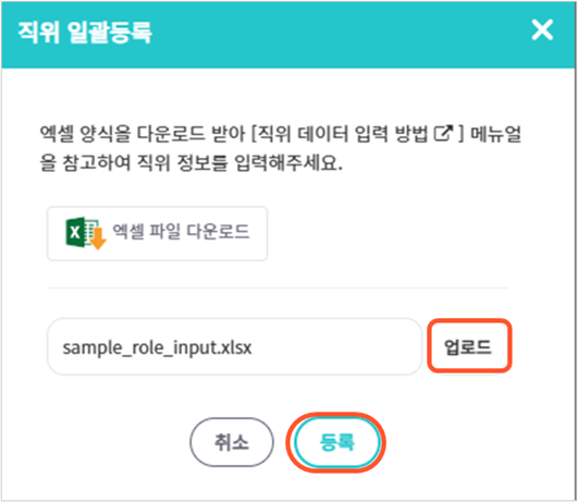 4. ‘직위 일괄등록’ 창에서 업로드 버튼을 클릭하여 위에서 작성한 파일을 선택한 후 등록 버튼을 클릭합니다.