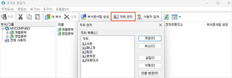 6. 직위 등록 내용은 조직도 편집기를 실행하여 확인할 수 있습니다.
