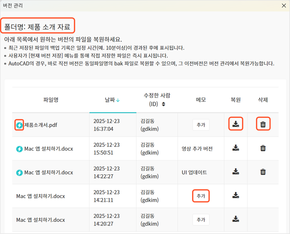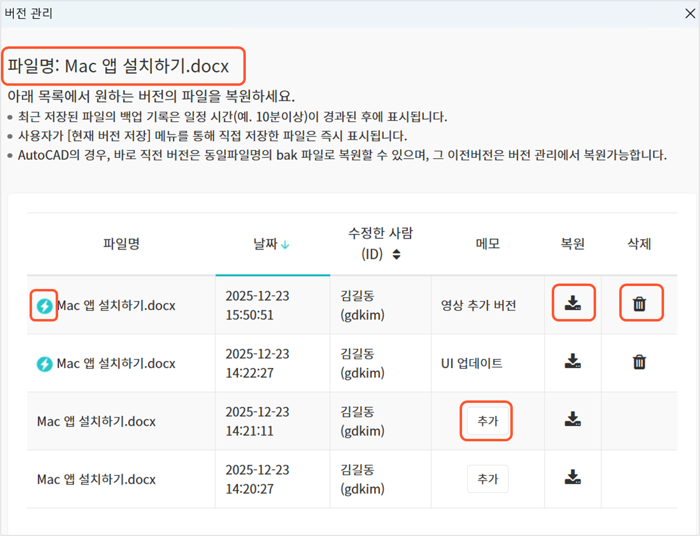관리’ 창에서 버전관리 된 파일 목록 중 원하는 날짜/시간의 파일 선택 후