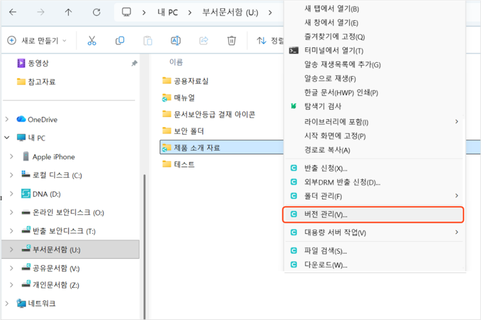 탐색기 화면에서 복원하고자 하는 파일이 속한 폴더를 선택한 후 마우스 우클릭하여 버전 관리를 클릭합니다.